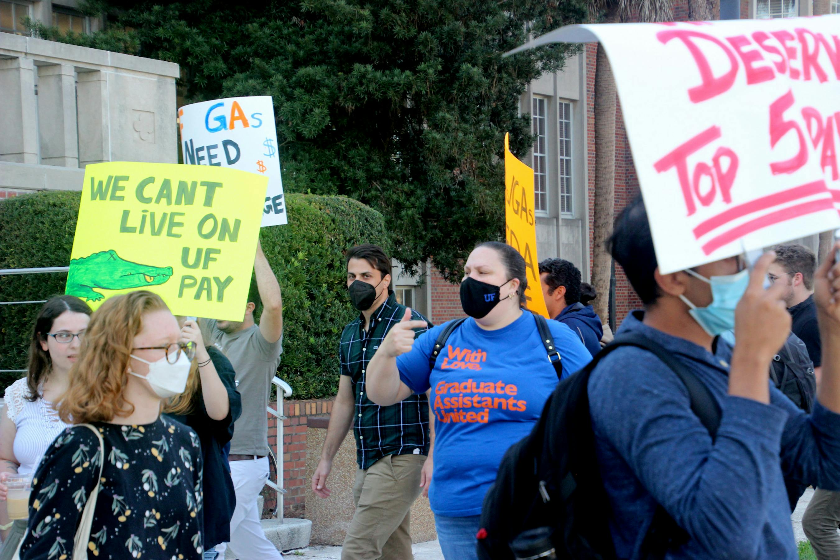 Students, faculty and other community members gathered for a protest outside of Tigert Hall to bring awareness to low wages of teaching assistants throughout the college. They shouted "GAs Deserve Living Wage" and marched around on SW 13th Street on March 1 from 4 p.m. to 6 p.m.