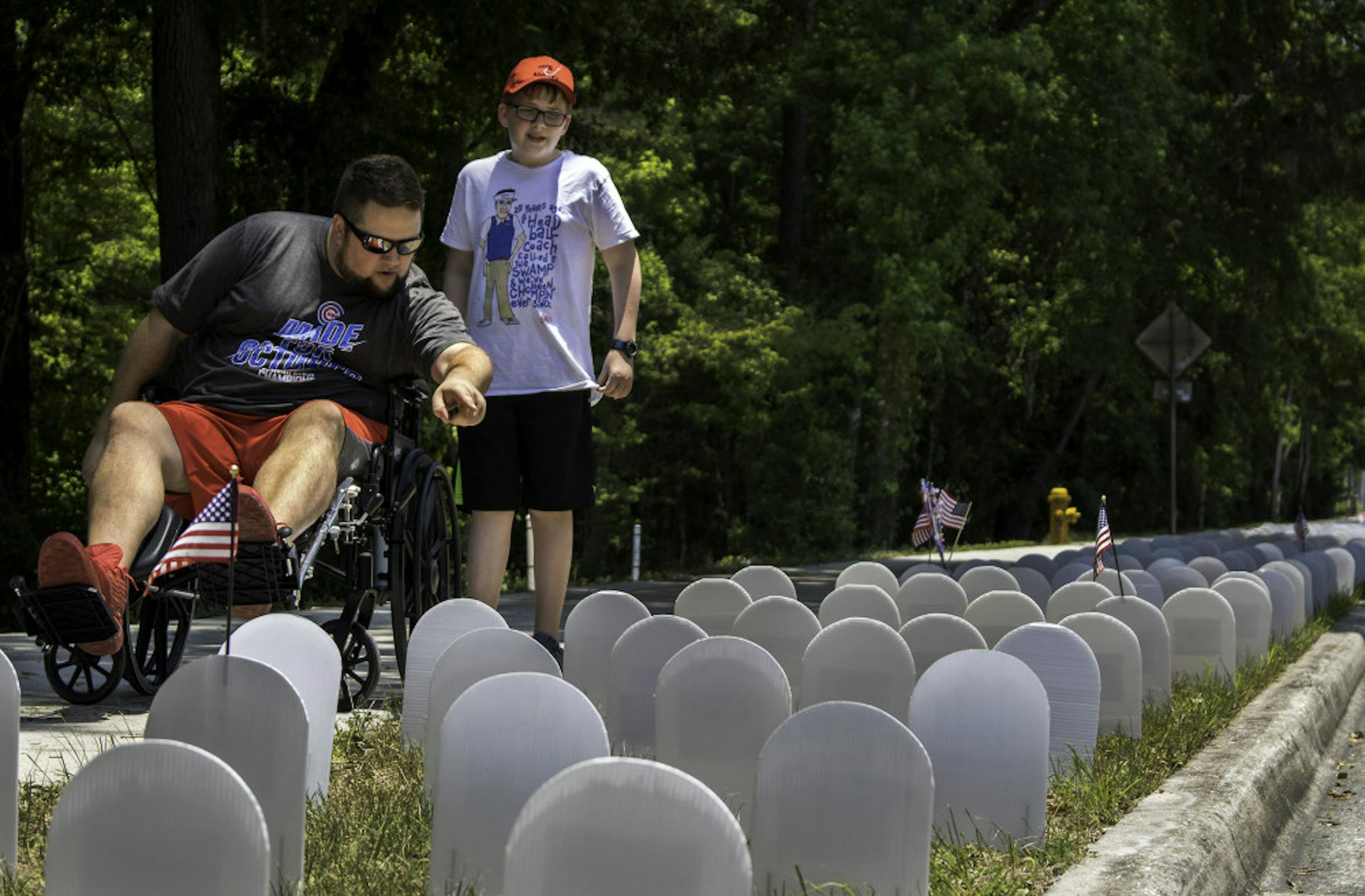 The Memorial Day Ceremony 2019 was held at Forest Meadows Memorial Park East on Monday. The event featured a presentation of the colors by the Vietnam Veterans of America and the Milton Lewis Young Marines. Remarks were made by Mayor Lauren Poe and Congressman Ted Yoho, the United States Representative for Florida’s 3rd congressional district. Alachua County Gold Star Families, which are families of soldiers killed in action, were also honored. Additionally, on Northwest 8th Avenue, the Gainesville chapter of Veterans For Peace placed one tombstone for each U.S. service member who lost their life in Iraq or Afghanistan since 2001 for the Memorial Mile 2019 event.