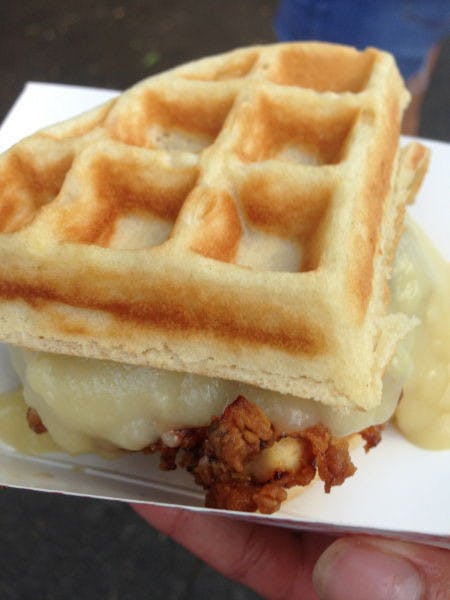 One of the most interesting dishes I saw at the rally was the chicken and waffle sliders.This dish wins my award for the best item at the rally. Though sliders tend to have a reputation for being small appetizers, this slider defies all its predecessors. It easily serves as a meal– a delectable one at that. Bursting with flavor, this slider is essentially a deep fried chicken breast smothered with maple gravy and sandwiched between two quarters of a waffle. The chicken had a crispy, thick exterior fried to perfection, and the maple gravy tied the entire slider together, adding that bit of sweetness needed counteract to the saltiness of the chicken. If I could recommend one item to readers, this would be it.