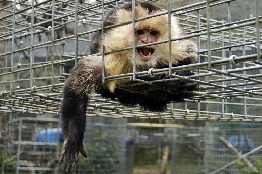 A baby brown-faced capuchin monkey hangs on the side of a habitat in the Jungle Friends Primate Sanctuary on Tuesday. Two hundred and seven monkeys live in the 44-acre sanctuary.