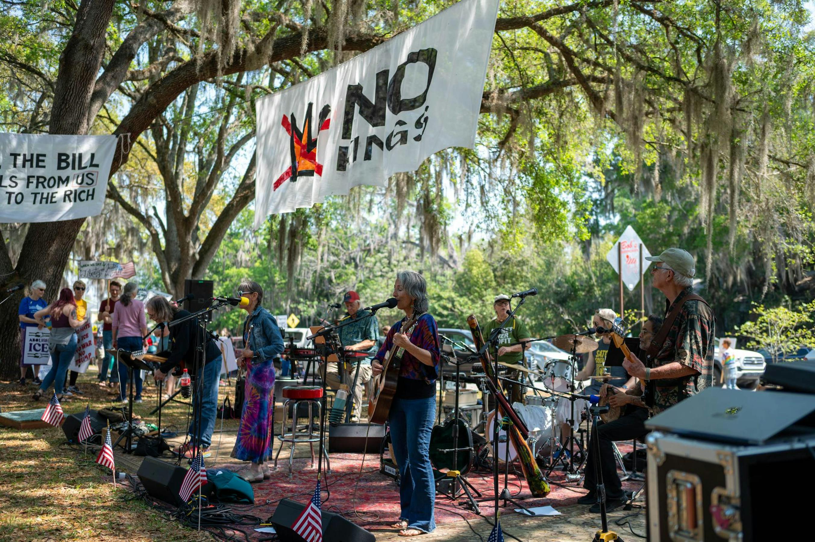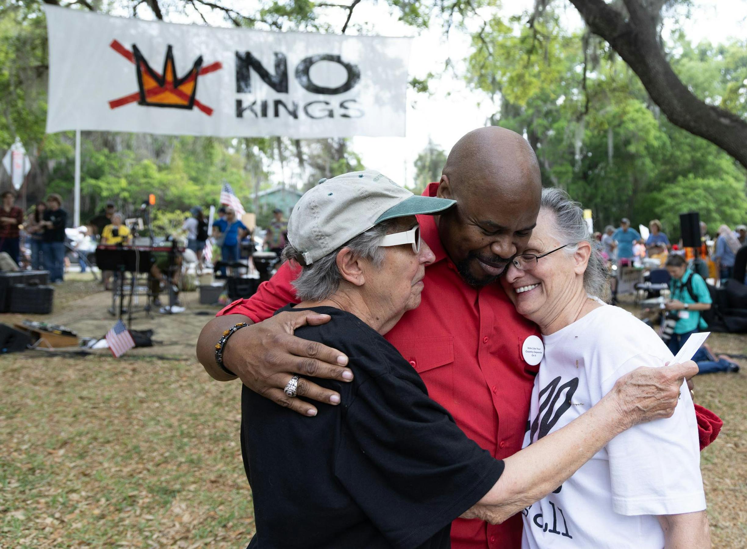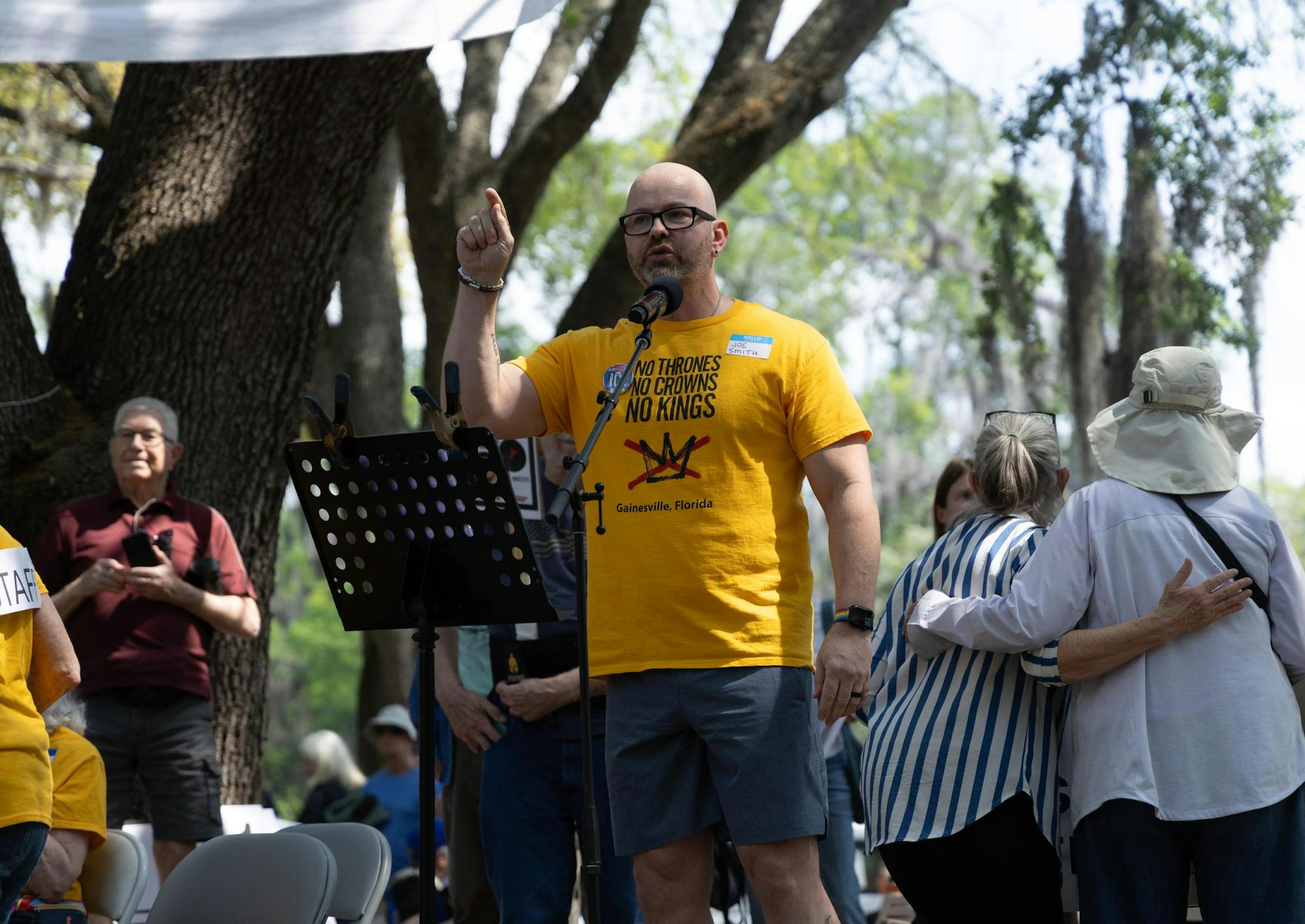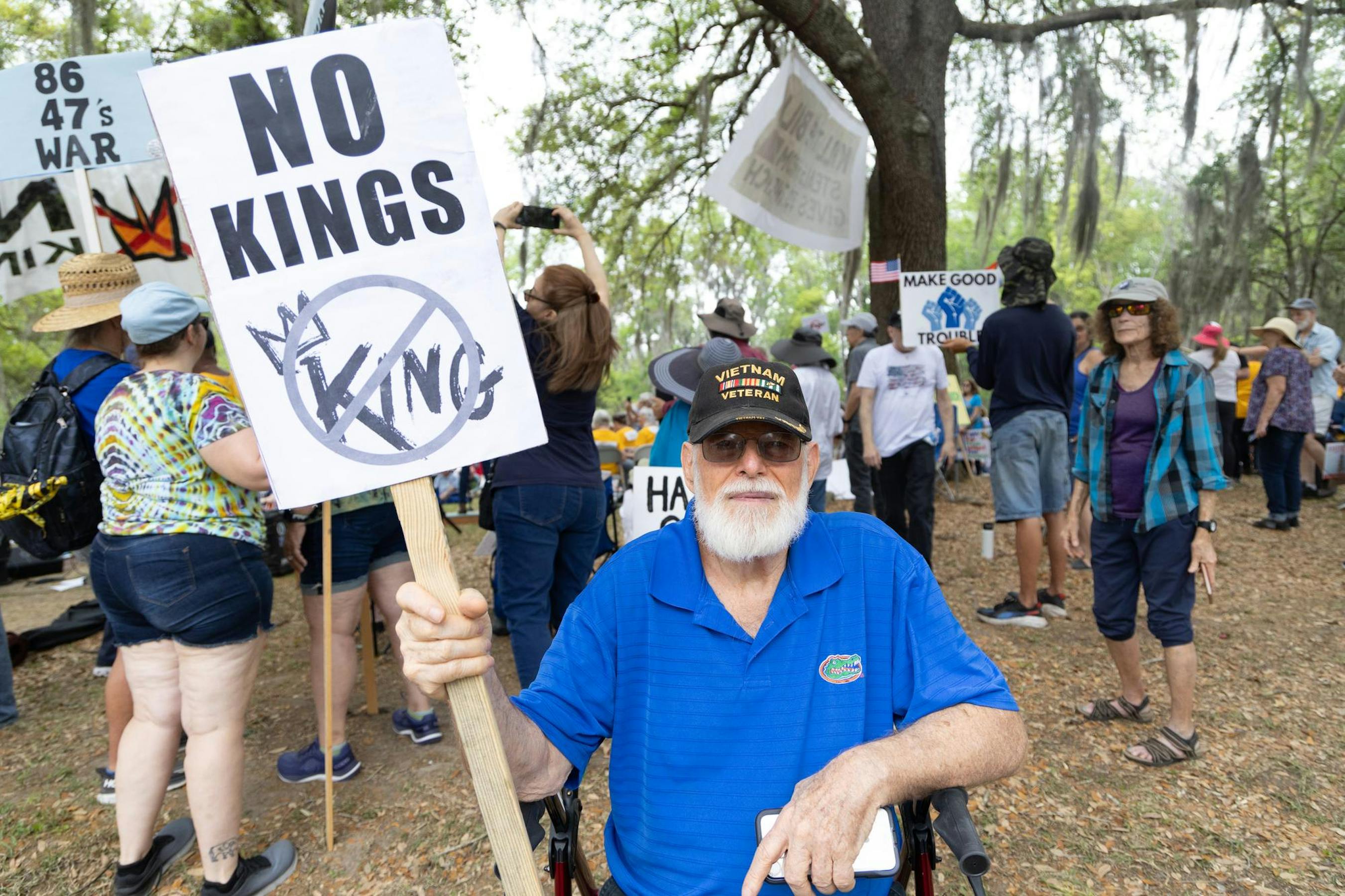 About 2,000 people gathered at Gainesville’s Cora Roberson Park on Saturday to protest the Trump administration. The protest was part of No Kings demonstrations planned across the country — the third since the series began June 14, 2025, and the first of this year.