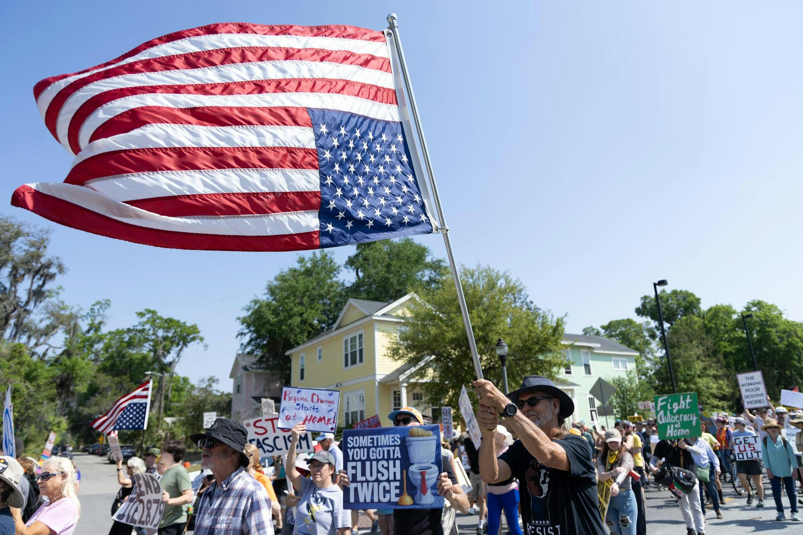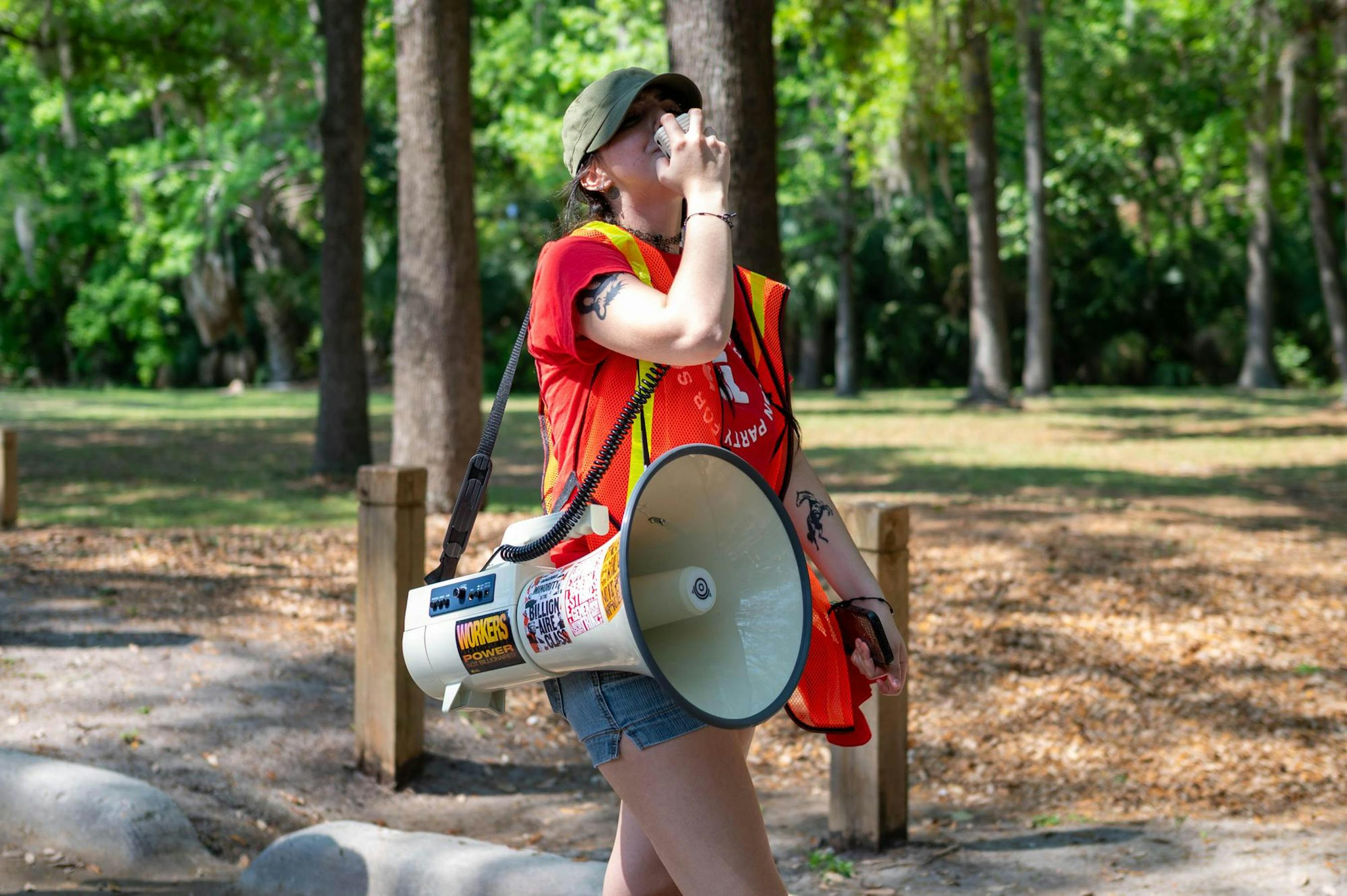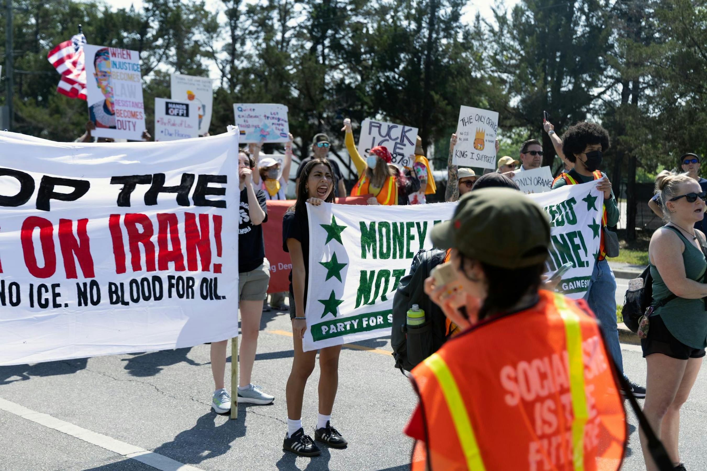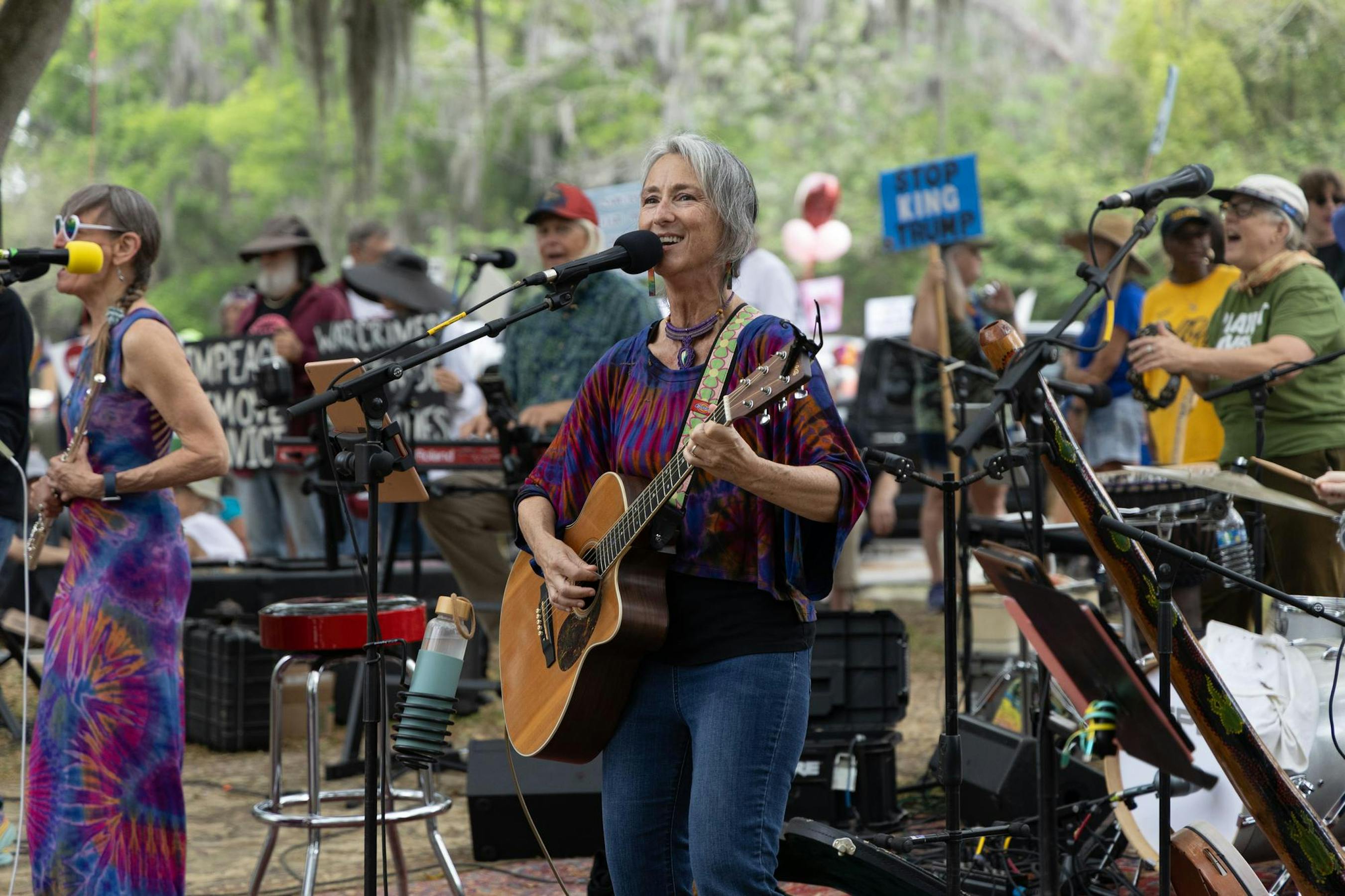 About 2,000 people gathered at Gainesville’s Cora Roberson Park on Saturday to protest the Trump administration. The protest was part of No Kings demonstrations planned across the country — the third since the series began June 14, 2025, and the first of this year.