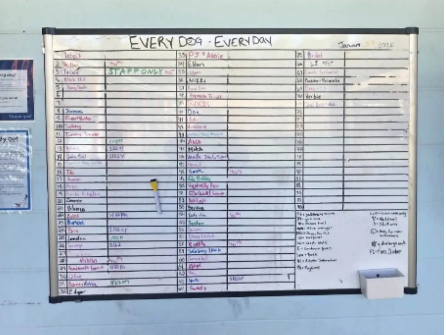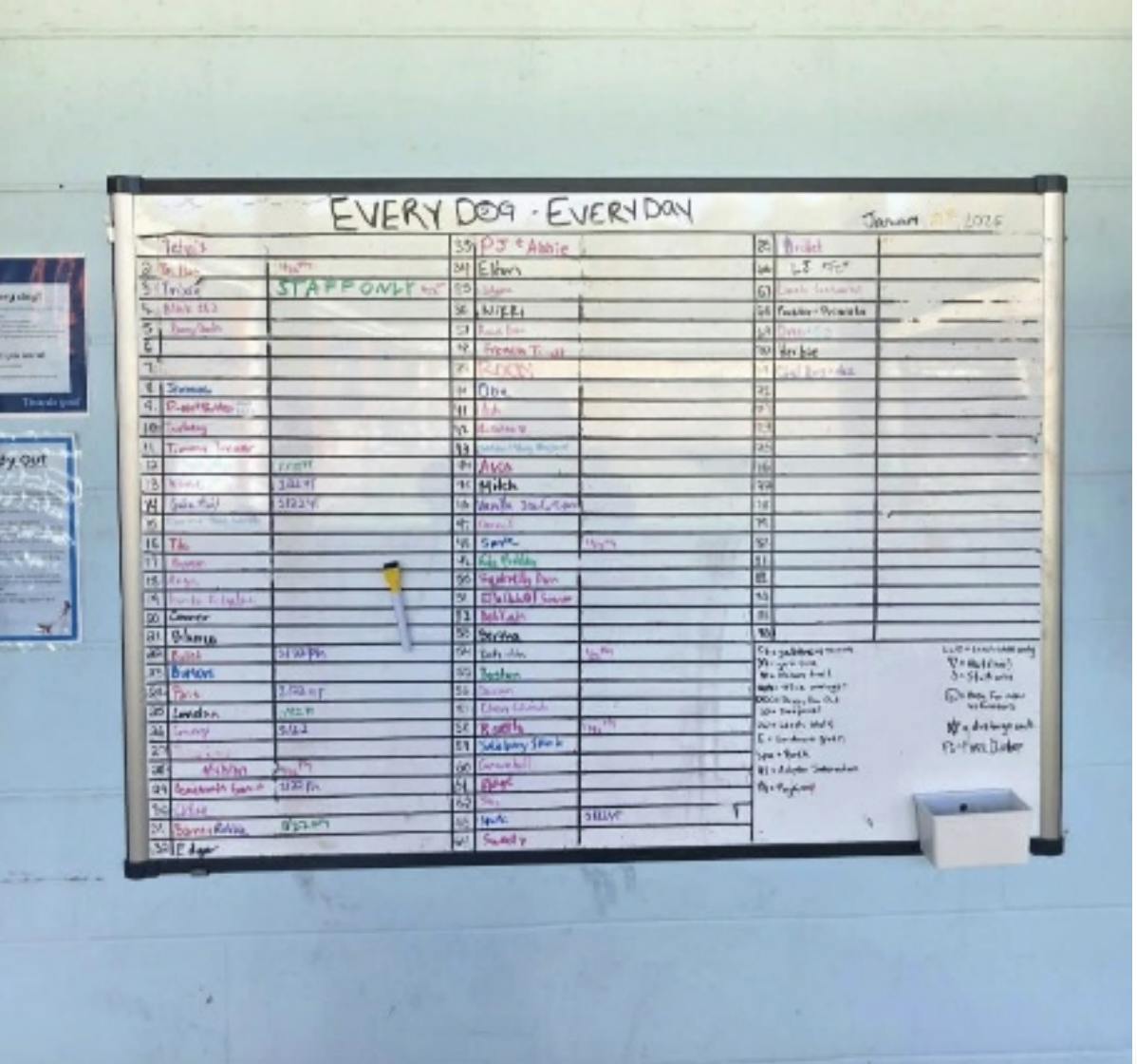 By Kaitlyn McCormack | 12:21amA chart at Alachua County Animal Resources tracks which dogs have been let out of their kennels on March 31, 2026.