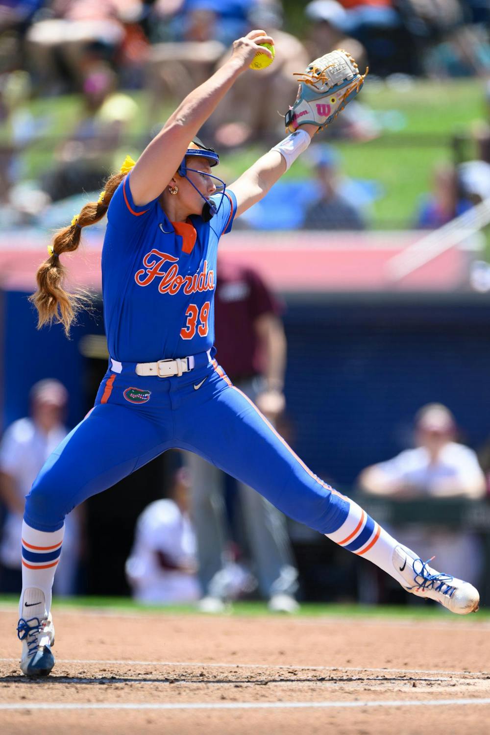 Florida right-handed pitcher Katelynn Oxley (39) throws during an NCAA softball game against Mississippi State, Saturday, April 4, 2026, in Gainesville, Fla.