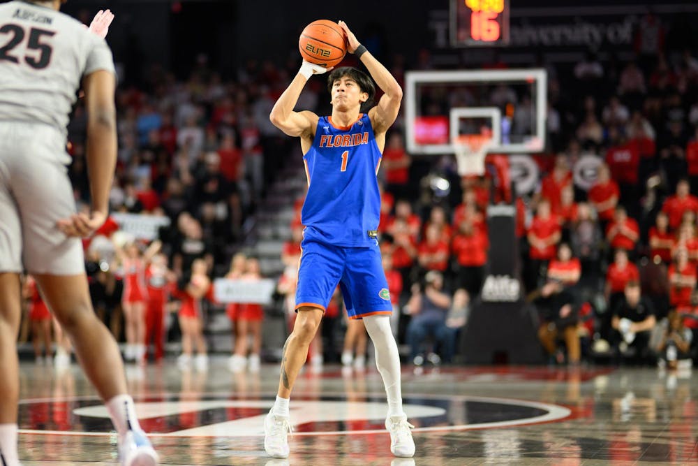 Florida guard Xaivian Lee (1) shoots a three during the first half of an NCAA college basketball game against Georgia, Wednesday, Feb. 11, 2026, in Athens, Ga.