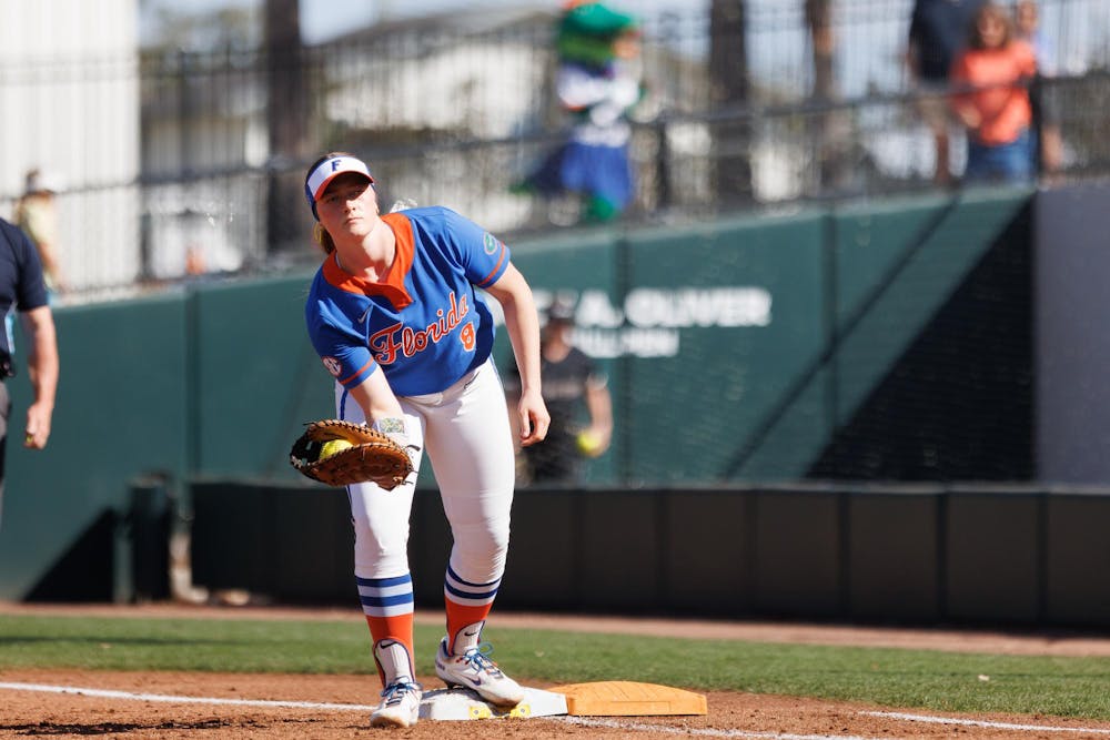 Florida catcher Jocelyn Erickson (8) catches the ball at first base during an NCAA softball game against Lindenwood, Saturday, Feb. 21, 2026, in Gainesville, Fla.