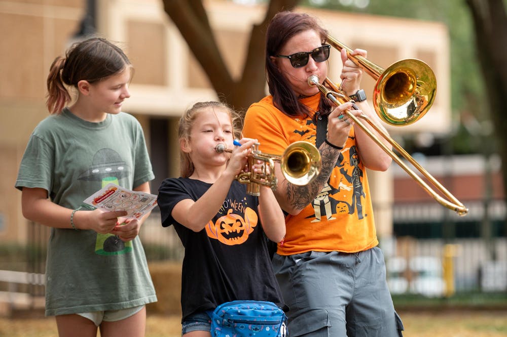 Gainesville families try playing the tuba at the first annual Great Pumpkin Bash at Bo Diddley Plaza in Fla. on Oct. 11, 2025.