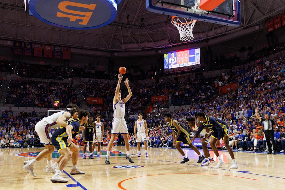 Florida Gators center Olivier Rioux (32) takes a free throw during the second half of a NCAA college basketball game against Merrimack, Friday, Nov. 21, 2025, in Gainesville, Fla.