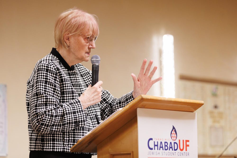 Auschwitz survivor Sora Vigorito speaks at an International Holocaust Remembrance Day event at the Chabad UF Jewish Center in Gainesville, Fla., Wednesday, Jan. 21, 2026.