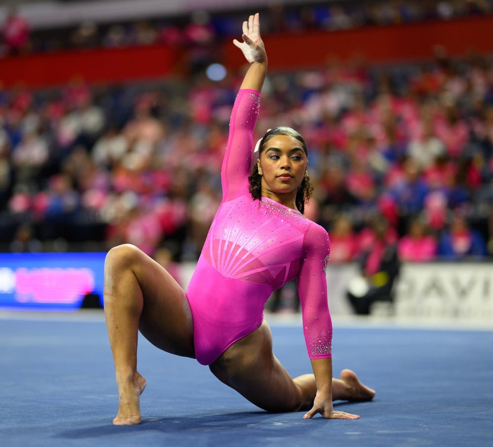 Florida gymnast eMjae Frazier performs on the floor during an NCAA gymnastics meet against Oklahoma, Friday, Feb. 13, 2026, in Gainesville, Fla.