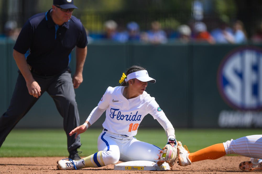 Florida infielder Gabi Comia tags a runner out during an NCAA softball game against Tennessee, Saturday, March 21, 2026, in Gainesville, Fla.
