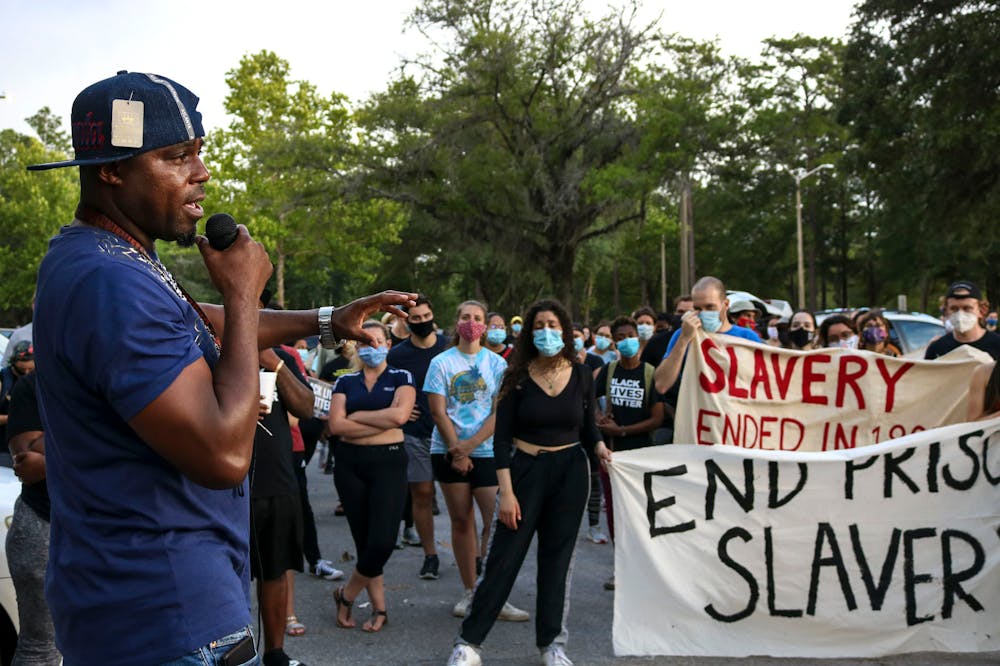 Tyrone Whetstone addresses the crowd of protestors Friday at the Alachua County Jail during the Juneteenth Liberation Rally hosted by the Legal Empowerment and Advocacy Hub along with Florida Prisoner Solidarity.