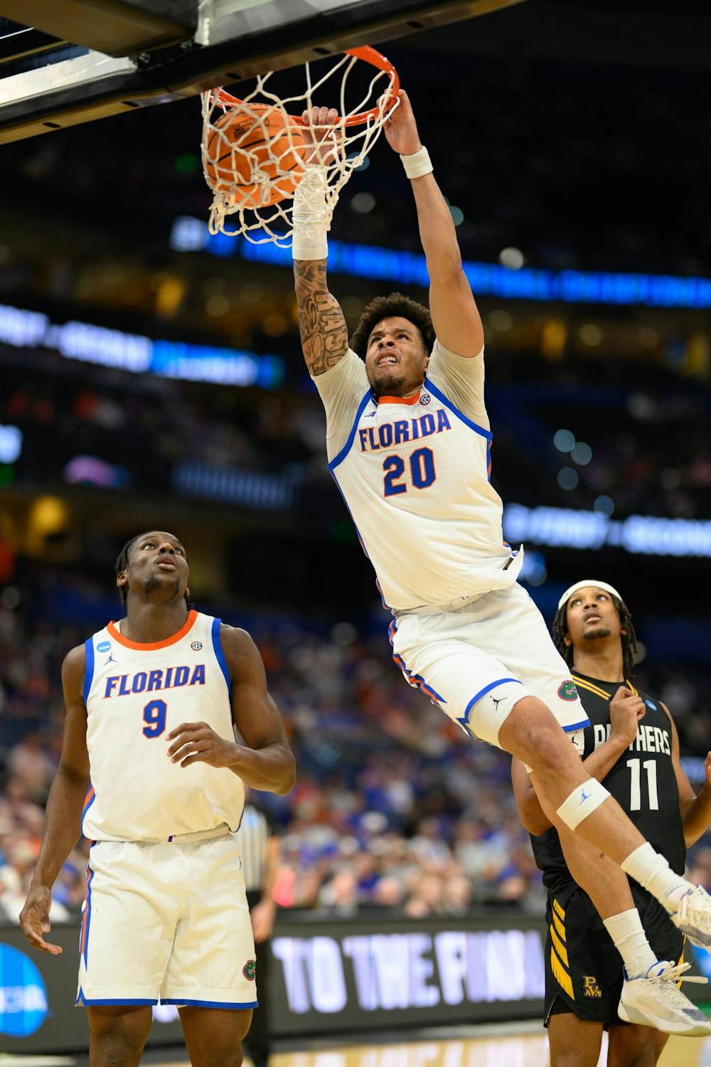 Florida guard Isaiah Brown (20) dunks during the second half of an NCAA Tournament first round game against Prairie View A&M, Friday, March 20, 2026, in Tampa, Fla.