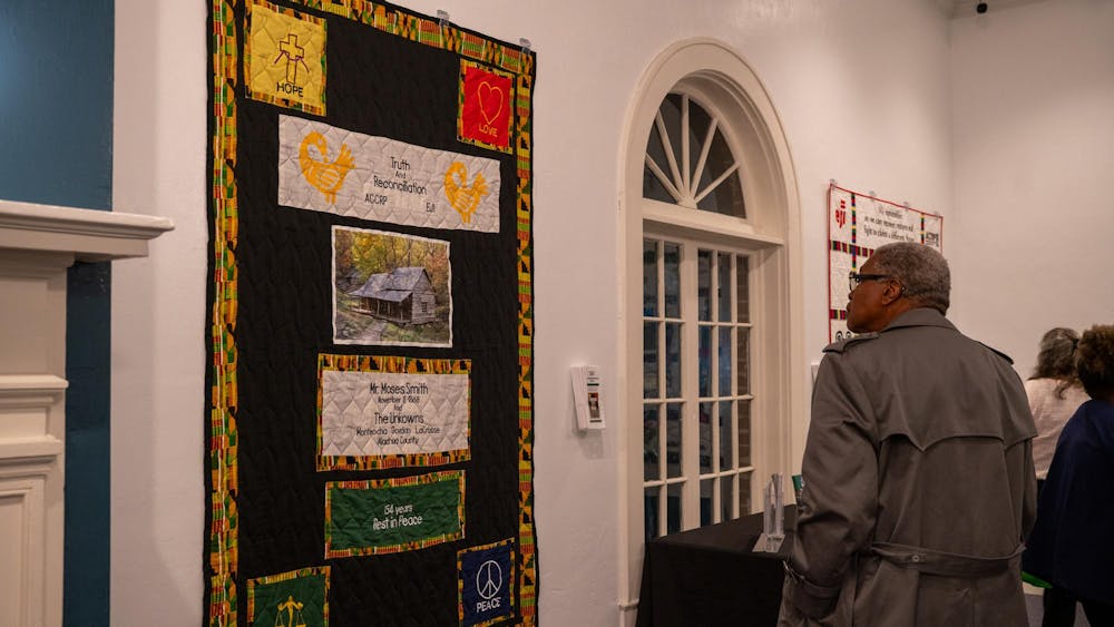 Onlookers view lynch remembrance quilts at Matheson History Museum in Gainesville, Fla., Wednesday, Jan. 21, 2026.