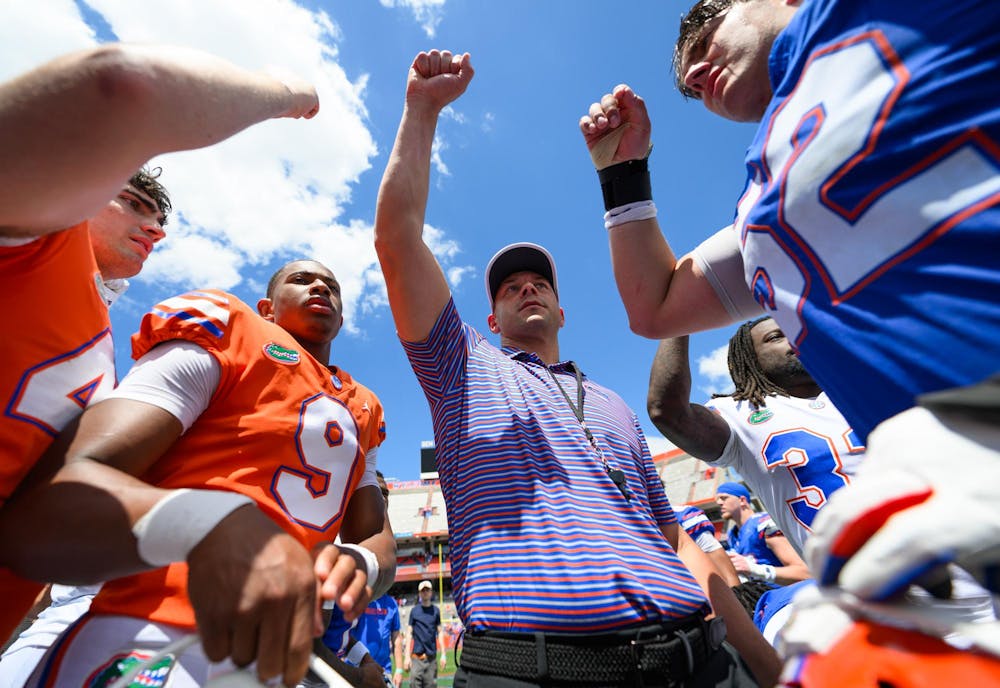 Florida head coach Jon Sumrall breaks the post-game huddle after the Orange & Blue spring football game, Saturday, April 11, 2026, in Gainesville, Fla.