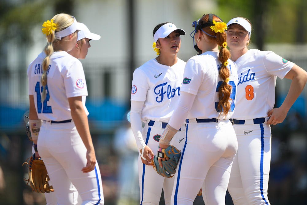 Florida infielder Gabi Comia (10) talks to the infield before an NCAA softball game against Tennessee, Saturday, March 21, 2026, in Gainesville, Fla.