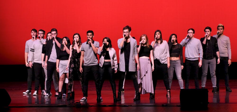 No Southern Accent, UF’s “premier co-ed a cappella” founded in 2001, performs at the International Championship of Collegiate A Cappella South Quarterfinals inside the Phillips Center for Performing Arts on Saturday night.