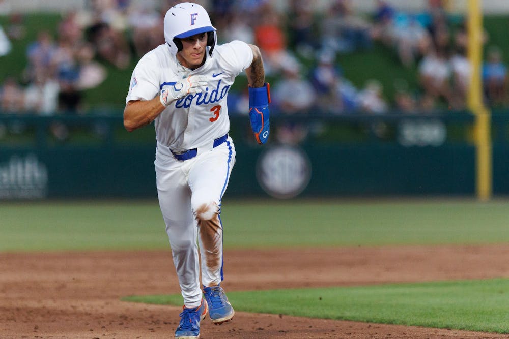 Florida outfielder Kyle Jones (3) runs to third base during an NCAA baseball game against Florida State University, Tuesday, March 10, 2026, in Gainesville, Fla.