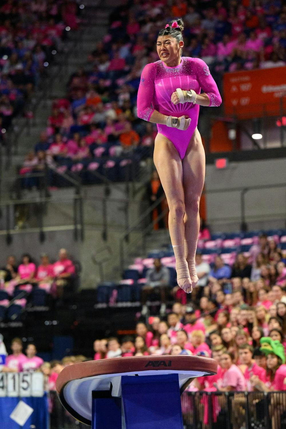 Florida gymnast Kayla DiCello performs on the vault during an NCAA gymnastics meet against Oklahoma, Friday, Feb. 13, 2026, in Gainesville, Fla.
