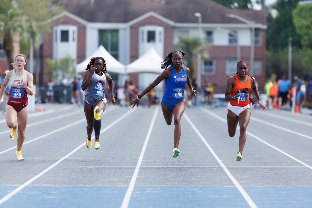 Gabrielle Matthews competes in the womens 100 meters during the Pepsi Florida Relays, Saturday, April 4, 2026, in Gainesville, Fla.