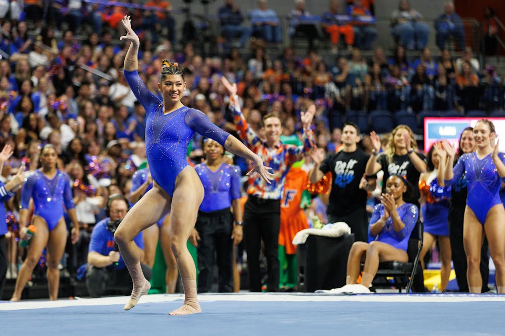 Florida gymnast Kayla DiCello performs on the floor during an NCAA gymnastics meet against Louisiana State University, Sunday, March 8, 2026, in Gainesville, Fla.