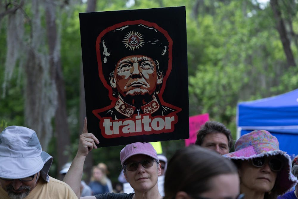 A protester holds a sign of Donald Trump with the word “traitor” underneath him during the No Kings Protest at Cora P. Roberson Park in Gainesville, Fla., Saturday, March 28, 2026.