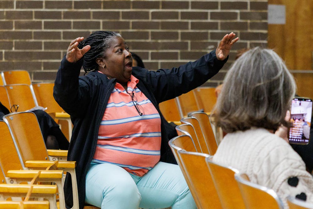 Court officer Rolanda Ford voices her concerns during a meeting about the future of the schools in Hawthorne, Florida, on Wednesday, Feb. 04, 2026.
