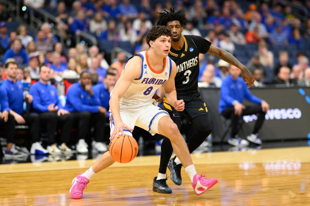 Florida guard Alex Kovatchev (8) drives during the second half of an NCAA Tournament first round game against Prairie View A&M, Friday, March 20, 2026, in Tampa, Fla.