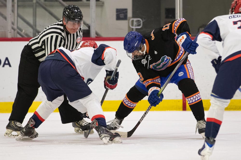 By Ryan Friedenberg | 11:16amMichael McCoy slaps the puck during the Gators' match against the ERAU Eagles on Sunday, September 7, 2025 at Community First Igloo in Jacksonville, Fla. / Photo by Ryan Friedenberg