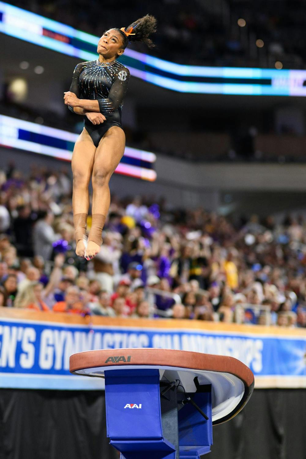 Florida gymnast Selena Harris-Miranda performs on the vault during the NCAA gymnastics National Championship against Oklahoma, LSU and Minnesota, Saturday, April 18, 2026, in Fort Worth, Texas.
