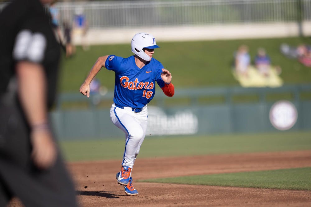 Florida outfielder Hayden Yost (16) runs to third base during an NCAA college baseball game against Auburn at Condron Family Ballpark in Gainesville, Fla., Friday, April 17, 2026.