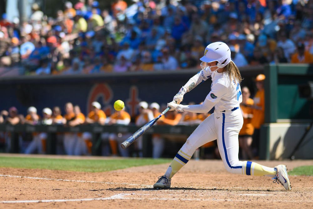 Florida outfielder Taylor Shumaker (21) hits during an NCAA softball game against Tennessee, Saturday, March 21, 2026, in Gainesville, Fla.