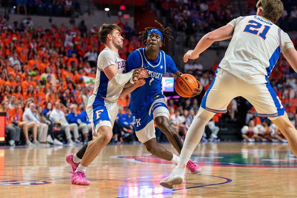 Kentucky guard Denzel Aberdeen (1) dribbles against Florida guard Urban Klavzar (7) during the second half of an NCAA college basketball game, Saturday, Feb. 14, 2026 at Exactech Arena in Gainesville, Fla.