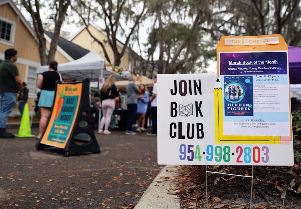 A sign advertising a book club is displayed during the Haile Farmers Market in Gainesville, Fla., Saturday, Feb. 28, 2026.