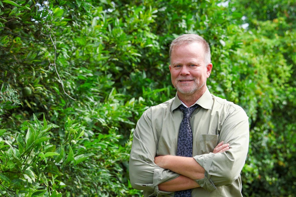 Dr. Kevin Folta, professor at the University of Florida Horticultural Sciences center poses infront of a citrus tree.
