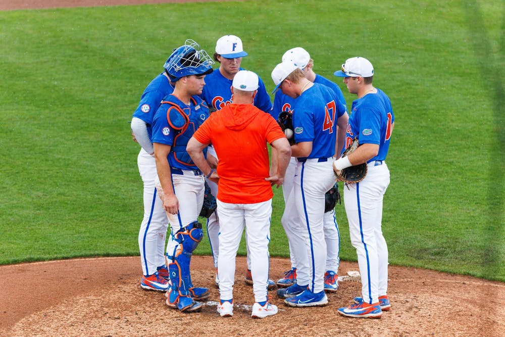 Florida Gators Head Coach Kevin O'Sullivan visits the mound during an NCAA Baseball game against High Point, Saturday, March 7, 2026, in Gainesville, Fla.