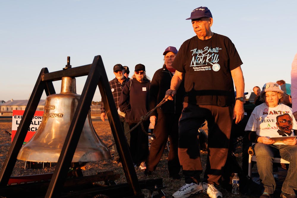 Joe Cinesi, a protester in opposition to the execution of Ronald Palmer Heath, rings the Delaware Bell outside Florida State Prison. Heath was executed in Raiford on Tuesday, Feb. 10, 2026.