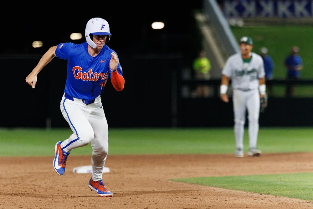 Florida outfielder Hayden Yost (16) runs to third base during an NCAA baseball game against Jacksonville University, Tuesday, March 31, 2026, in Gainesville, Fla.