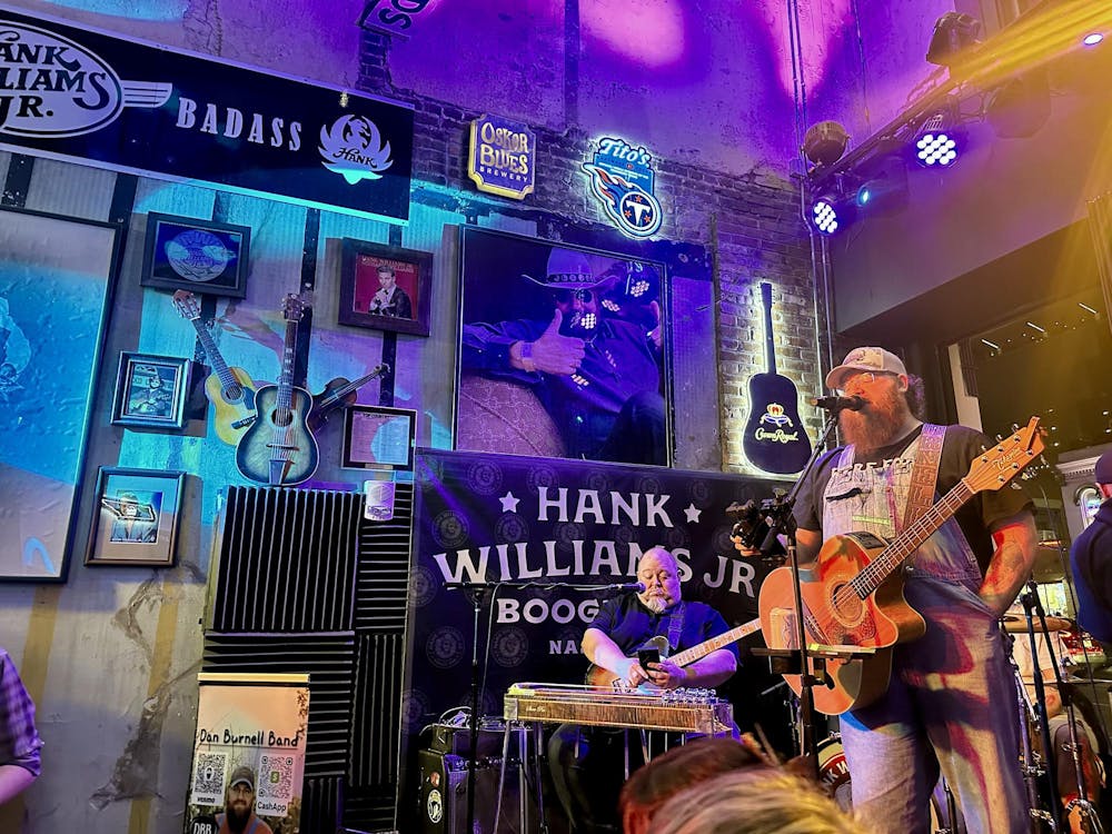 A band performs inside Hank Williams Jr.'s Boogie Bar, Feb. 21, 2026, in downtown Nashville, Tenn.