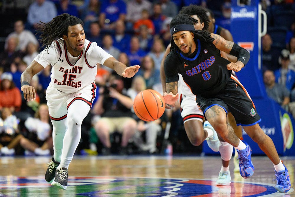 Florida guard Boogie Fland (0) chases a lost ball during the first half of an NCAA college basketball game against Saint Francis, Wednesday, Dec. 17, 2025, in Gainesville, Fla.