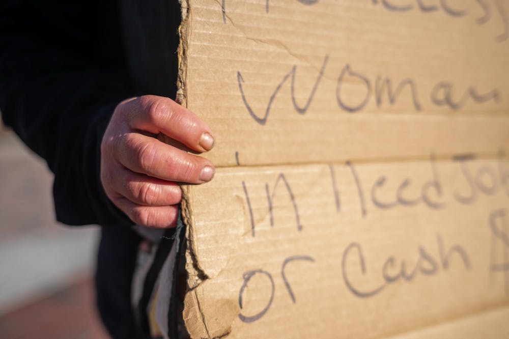 Alicia Childs stands on a street corner in downtown Gainesville, Fla., holding a sign asking passerby for cash or employment, Monday, Jan. 26, 2026.