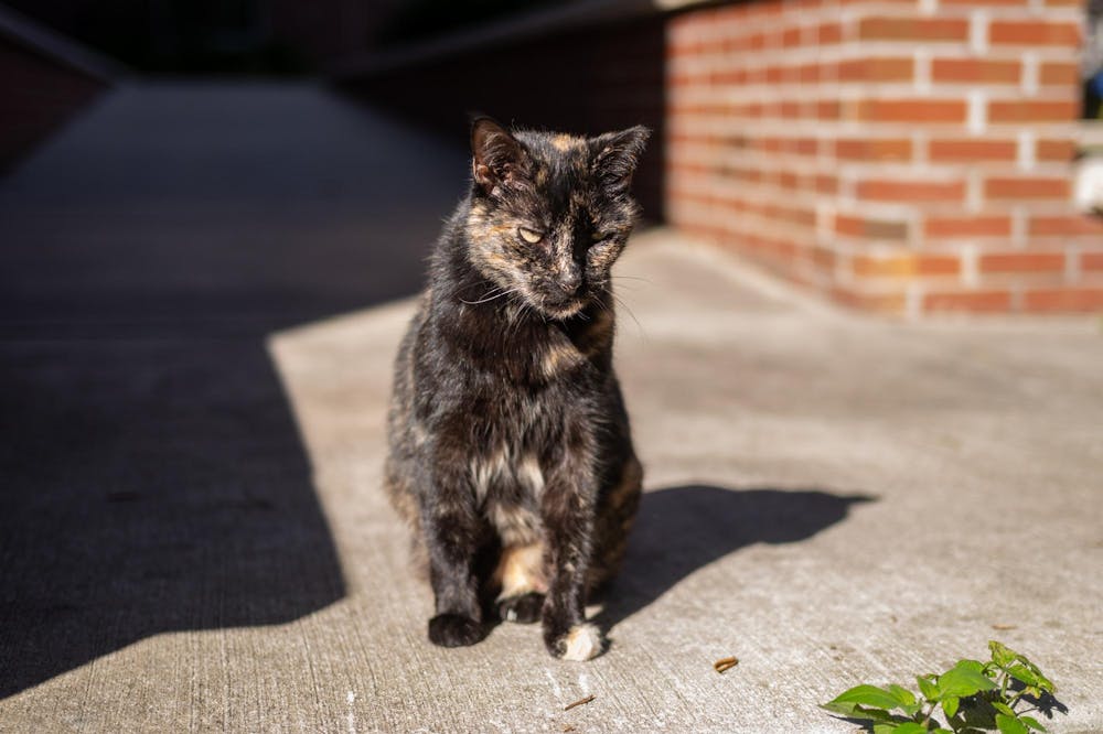 Campus cat Baby sits outside Pugh Hall, Friday, Jan. 23, 2026 in Gainesville, Fla.