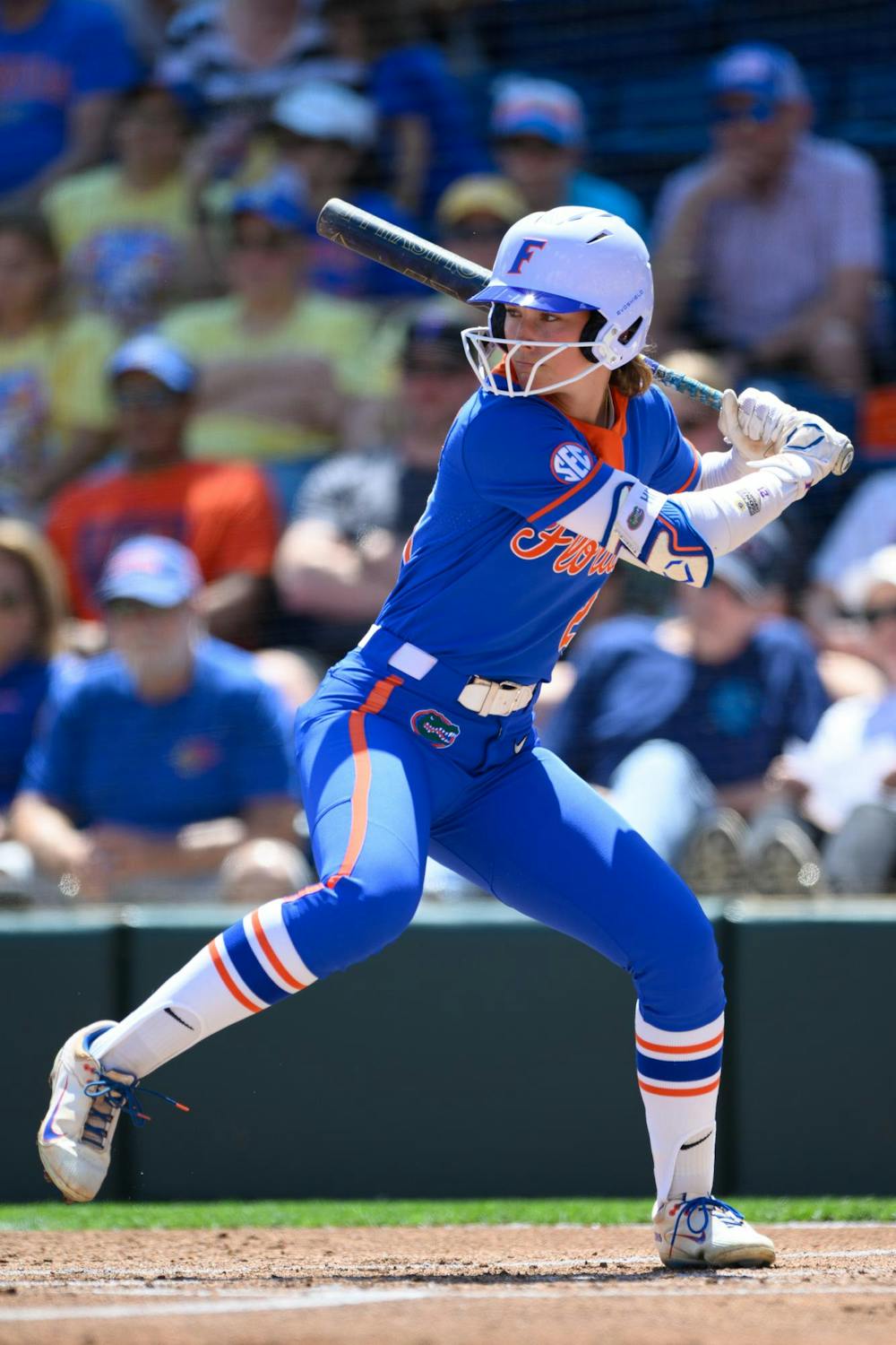 Florida outfielder Taylor Shumaker (21) hits during an NCAA softball game against Mississippi State, Saturday, April 4, 2026, in Gainesville, Fla.