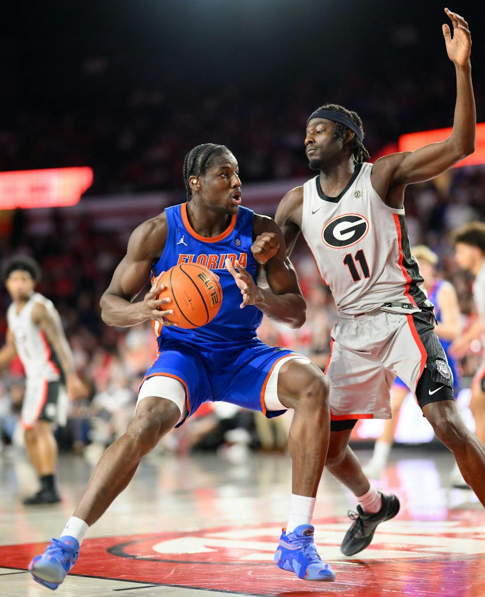 Florida center Rueben Chinyelu (9) drives against Georgia forward Dylan James (11) during the second half of an NCAA college basketball game against Georgia, Wednesday, Feb. 11, 2026, in Athens, Ga.