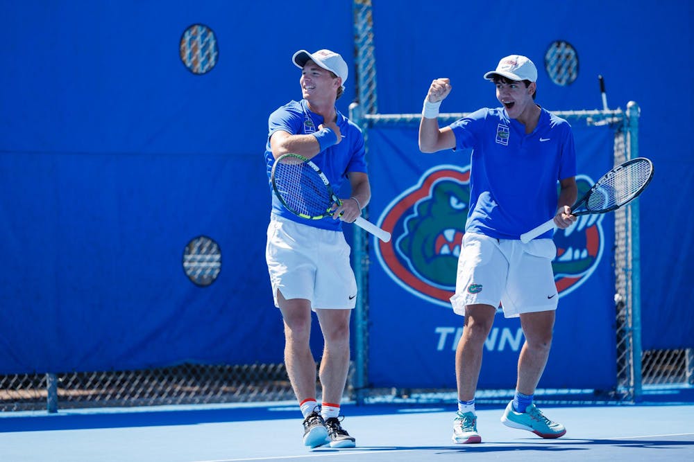Florida tennis players Kevin Edengren and Andreas Timini celebrate during an NCAA tennis match against South Carolina, Sunday, March 1, 2026, in Gainesville, Fla.