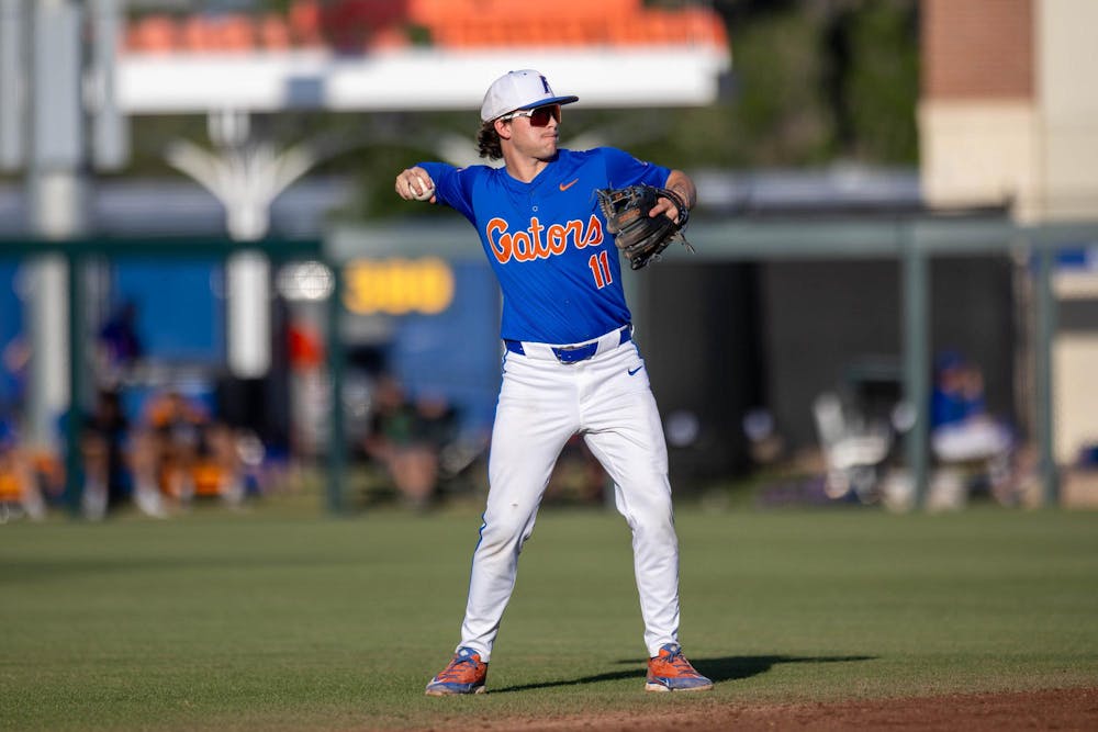 Florida infielder Brendan Lawson (11) throws the ball during an NCAA college baseball game against Auburn at Condron Family Ballpark in Gainesville, Fla., Friday, April 17, 2026.