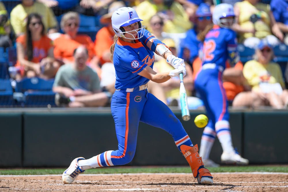 Florida infielder Kendall Grover (12) hits during an NCAA softball game against Mississippi State, Saturday, April 4, 2026, in Gainesville, Fla.