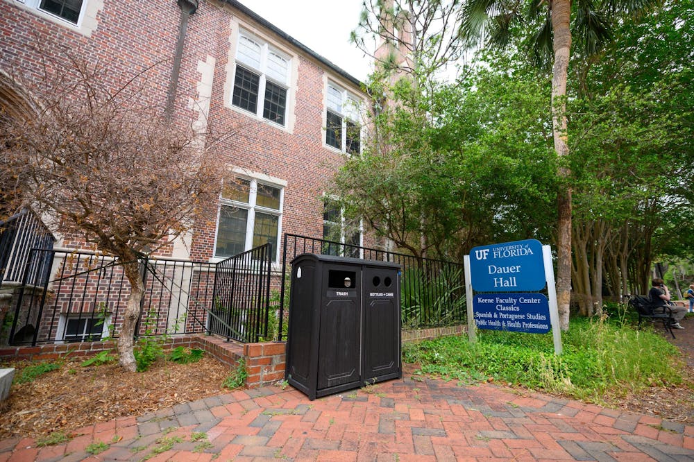 A sign for the Spanish and Portuguese departments stands outside Dauer Hall on UF's campus, Wednesday, April 8, 2026.
