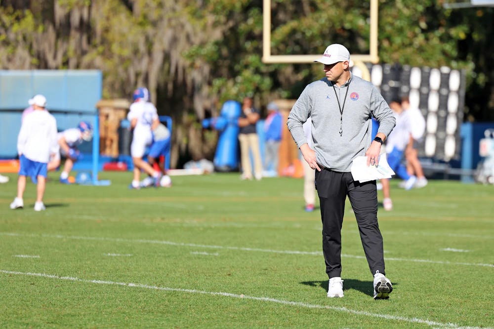 Florida football head coach Jon Sumrall watches the wide receivers during spring camp at the Heavener Football Training Center in Gainesville, Fla., on Tuesday, March 3, 2026.