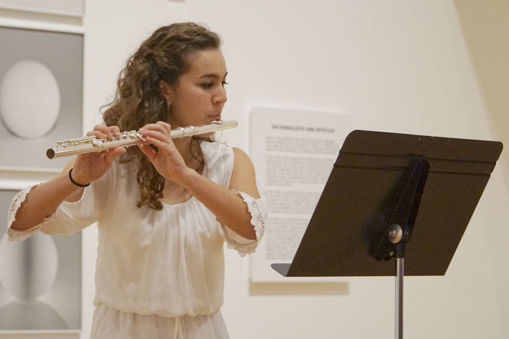 Sara Hoffen, an 18-year-old UF industrial and systems engineering freshman, plays her flute at the Harn’s Contemporary gallery on Oct. 8, 2015. Hoffen played multiple Disney-themed arrangements and said she has been playing the flute for eight years.